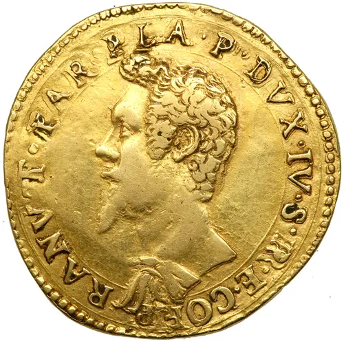 Technical/Grading: For collectors, key high-points on the obverse to assess wear include the highest curls of Ranuccio's hair, the ear, and the folds of his drapery or armor. On the reverse, critical areas are the crown's intricate details and the raised elements of the Farnese lilies and fess within the shield. Technical strike quality for gold issues of this period can vary; while often well-struck, minor planchet irregularities, slight off-centring, or weakness in peripheral legends are not uncommon. A premium example will exhibit sharp details across both sides with minimal evidence of wear or strike imperfections.