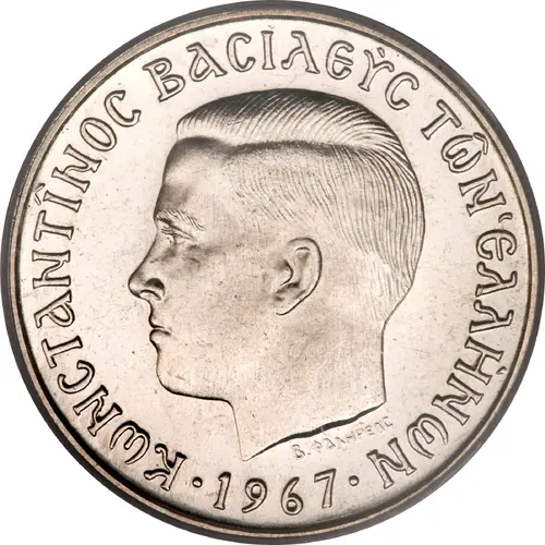 | Ön yüz lejandı | ΚωΝCΤaΝΤΙΝΟC ΒaCΙλΕΥC ΤωΝ ΕλλΗΝωΝ ·1967· (Translation: CONSTANTINE KING OF THE GREEKS ·1970·) |