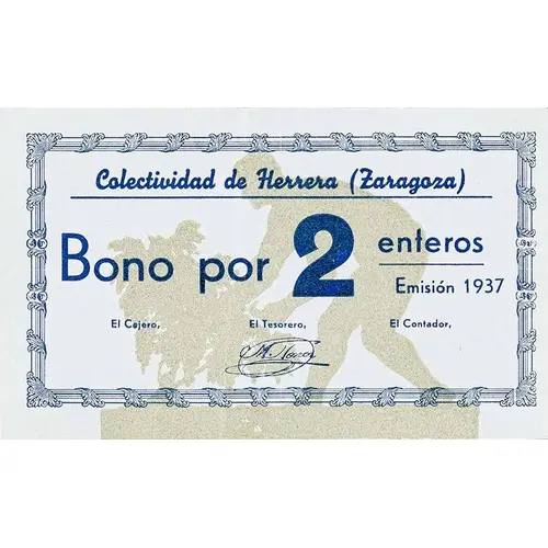 Colectividad de Herrera (Zaragoza) Bono por 2 enteros Emisión 1937 (Translation: Collectivity of Herrera (Zaragoza) Bond for 2 Enteros Issue 1937) |
