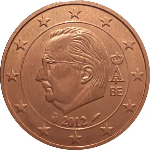 | Obverse description | The left profile portrait of King Albert II (modified from the one on the 1999-2007 coins) is surrounded by the twelve stars of the Union, between two of which are the letters BE for `Belgium` and the royal monogram: an A with the numeral II underneath, topped by a crown. As of 2009, the effigy is again the same as on the 1999-2007 coins, because the change of effigy in 2008 was contrary to the recommendations of the ECOFIN Council. |