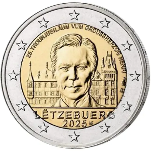 | Obverse description | Portrait of Grand Duke Henri of Luxembourg in front of the Grand Ducal Palace. The text `25. TROUNJUBILÄUM VUM GROUSSHERZOG HENRI` is inscribed in a semicircle at the top of the design. The name of the country `LËTZEBUERG`, the engraver`s initials `MF` and the date `2025` appear below the effigy of Grand Duke Henri. The outer ring of the coin represents the twelve stars of the European flag. |