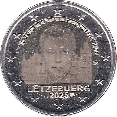 Portrait of Grand Duke Henri of Luxembourg in front of the Grand Ducal Palace. The text `25. TROUNJUBILÄUM VUM GROUSSHERZOG HENRI` is inscribed in a semicircle at the top of the design. The name of the country `LËTZEBUERG`, the engraver`s initials `MF` and the date `2025` appear below the effigy of Grand Duke Henri. The outer ring of the coin represents the twelve stars of the European flag. |