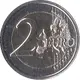 A geographical map of Western Europe spans the outer ring and inner core on the right side of the coin. The inscription 2 EURO is superimposed over the map of Europe, with the numeral “2” located in an open field representing the eastern Atlantic Ocean. 12 stars are located on the right side of the outer ring, with six stars atop the map of Europe and six stars below it; six vertical stripes cut across the inner core of the coin, visually connecting the upper and lower star segments. |