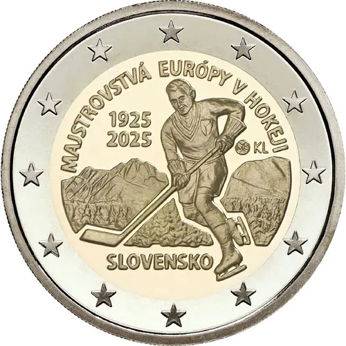 نوشته‌های روی سکه MAJSTROVSTVÁ EURÓPY V HOKEJI 1925 2025 MK KL SLOVENSKO