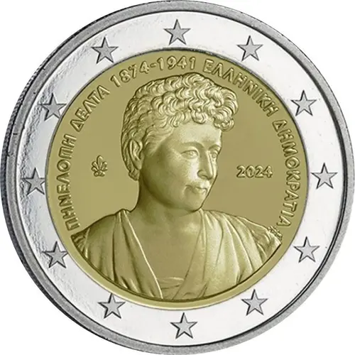 | Obverse description | The design features a portrait of Penelope Delta. The theme is bordered by the wording ‘ΠΗΝΕΛΟΠΗ ΔΕΛΤΑ 1874-1941’ (‘PENELOPE DELTA 1874-1941’) and ‘ΕΛΛΗΝΙΚΗ ΔΗΜΟΚΡΑΤΙΑ’ (‘HELLENIC REPUBLIC’). To the left is a palmette (mintmark of the Greek Mint) and to the right the minting year. Penelope Delta was a pioneer of children’s literature in Greece. Generations of Greek children have been raised with her books, which remain popular. The coin’s outer ring depicts the 12 stars of the European flag. |