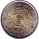 | Mô tả mặt trước | The world in the form of a euro symbol in the center, showing how the euro has become a truly global player over the last ten years. The surrounding elements symbolize the importance of the euro to ordinary people (represented by a family group), to the financial world (the Eurotower), to trade (a ship), to industry (a factory), and to the energy sector and research and development (two wind turbines). The designer’s initials, “A.H.”, can be found (if you look very carefully) between the ship and the Eurotower. Along the upper and lower edges of the inner part of the coin are, respectively, the country of issue and the years “2002 – 2012”. The coin will be issued by all euro area countries. The coin’s outer ring depicts the 12 stars of the European Union. |