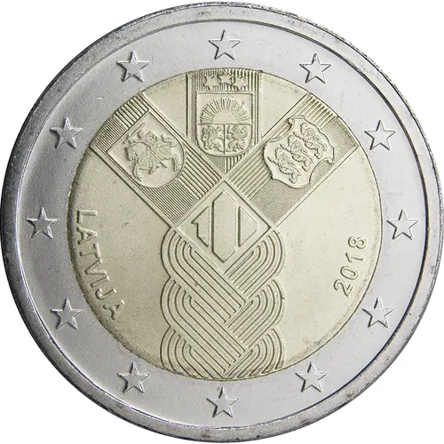 | Obverse description | The coin features the three Baltic sisters (Estonia, Latvia and Lithuania) with braided hair. Above the coats of arms of the three Baltic countries; on the right the year of issue `2018`; on the left the word `LATVIJA`. The coin’s outer ring bears the 12 stars of the European Union. |