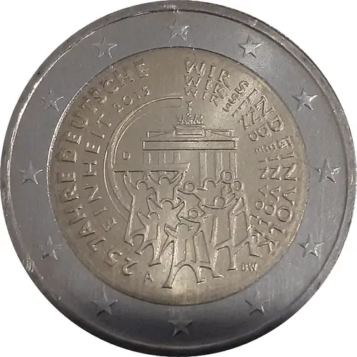 | Obverse description | The people in the foreground, who embody a new beginning and the advance towards a better future, are standing in front of the Brandenburg Gate, a symbol of German unity. The rendering of the statement Wir sind ein Volk (‘we are one people’) — a collective expression of will by German citizens – represents the path forwards towards German reunification. The inner part also features the mint mark of the respective mint (‘A’, ‘D’, ‘F’, ‘G’ or ‘J’) as well as the issuing country’s country code ‘D’ and the engraver’s mark (the initials ‘BW’ — Bernd Wendhut). The coin’s outer ring bears the 12 stars of the European Union. |
