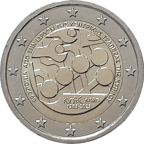 | Mô tả mặt trước | The design depicts tools on a microchip symbolising the stability of the economy in the modern industrial and digital era secured by the Central Bank of Cyprus, which celebrates 60 years of existence. The issuing country`s name ‘ΚYΠΡΟΣ KIBRIS’ and the dates ‘1963-2023’ are at the bottom. Additionally, the phrase ‘60 ΧΡOΝΙΑ ΑΠO ΤΗΝ IΔΡΥΣΗ ΤΗΣ ΚΕΝΤΡΙKHΣ ΤΡAΠΕΖΑΣ ΤΗΣ ΚYΠΡΟΥ’ (i.e. 60 years since the foundation of the Central Bank of Cyprus) is inscribed on the inner part of the national side of the coin. The coin’s outer ring depicts the 12 stars of the European flag. |