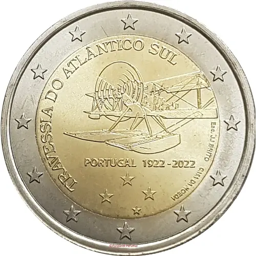 | Obverse description | This crossing was achieved by using only internal means of navigation: a modified sextant and a course corrector. The design shows the representation of the Lusitânia seaplane, one of the three Fairey III biplanes that were used by the commander and pilot Sacadura Cabral and the navigator Gago Coutinho, accomplish the flight between Lisboa and Rio de Janeiro. The edge inscription reads ‘TRAVESSIA DO ATLÂNTICO SUL’. Below the plane, the inscription ‘PORTUGAL 1922-2022’. The Mintmark will be ‘CASA DA MOEDA’, the Portuguese name of the Mint. The coin’s outer ring depicts the 12 stars of the European flag. |