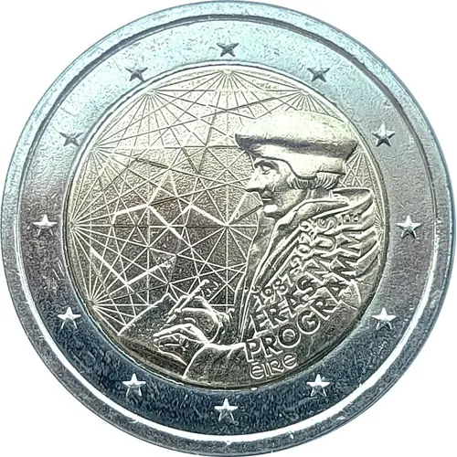 The design is a mix of two major elements of the Erasmus programme: the original intellectual inspiration, Erasmus himself, and the allegory of its influence over Europe. The first one is symbolised by one of the most known depiction of Erasmus. The second one is symbolised by a beam of links going across the coin from a beacon to another, representing the numerous intellectual and human exchanges between the European students. As a reference to Europe, some of these links form other stars, born from the synergy between the countries. The figure 35, for 35th anniversary comes out from the stars in a contemporary graphical style. The outer ring depicts the twelve stars of the European flag. |