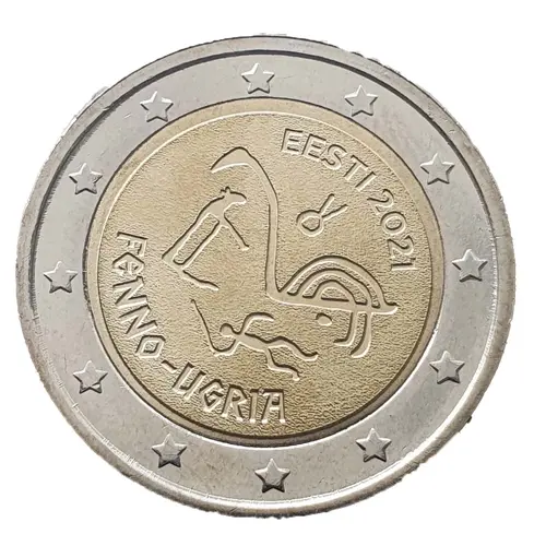 The national side of the coin depicts a design based on the cave drawings of Lake Äänisjärv. The symbols for the hunter, the elk, the water bird and the sun form the symbolic circle of life for the Finno-Ugric peoples. The central figure is a water bird, as they are represented in the art and folklore of all Finno-Ugric peoples. On the top right, in semi-circle, are the name of the country ‘EESTI’ followed by the year ‘2021’. At the bottom left is the inscription ‘FENNOUGRIA’. The coin’s outer ring depicts the 12 stars of the European flag. |