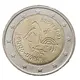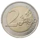 A geographical map of Western Europe spans the outer ring and inner core on the right side of the coin. The inscription 2 EURO is superimposed over the map of Europe, with the numeral “2” located in an open field representing the eastern Atlantic Ocean. 12 stars are located on the right side of the outer ring, with six stars atop the map of Europe and six stars below it; six vertical stripes cut across the inner core of the coin, visually connecting the upper and lower star segments. |