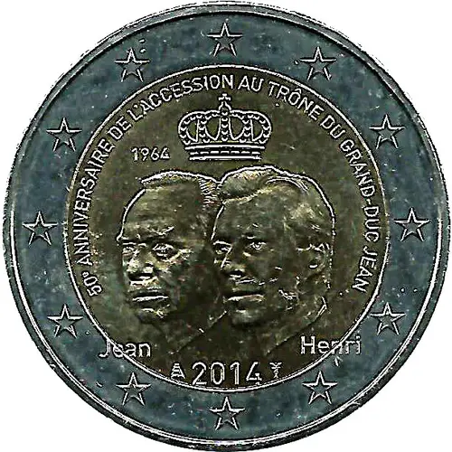 | Opschrift voorzijde | 50e ANNIVERSAIRE DE L’ACCESSION AU TRÔNE DU GRAND-DUC JEAN JEAN 2014 HENRI (Translation: 50th Anniversary of the Accession of Grand Duke-Jean to the Throne 2014 Henri) |