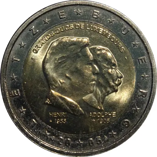 | Obverse description | The effigy of Grand Duke Henri facing right superimposed on the effigy of Grand Duke Adolphe in the centre with a legend above, and their names and dates below. In the outer ring of the coin, the twelve stars of the European Union surrounding the design are placed between the country name, the date, and the latter centred below the effigies and flanked by the letter ‘S’ on the left and the logo of the mint on the right. |