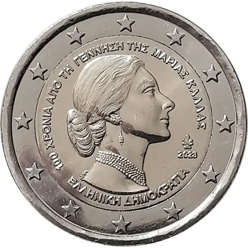 | Opis awersu | The design features a portrait of the legendary Greek soprano Maria Callas. Inscribed along the inner edge is the wording ‘100 YEARS FROM THE BIRTH OF MARIA CALLAS’, and at the right the minting year ‘2023’ and a palmette (mintmark of the Greek Mint); below the portrait runs the inscription ‘HELLENIC REPUBLIC’. The coin’s outer ring depicts the 12 stars of the European flag. |