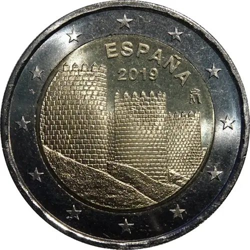 | Obverse description | The design reproduces at the centre a detail of the Avila wall. At the top side circular ascending the word `ESPAÑA` (Spain), the year of issue and the mint mark. The coin’s outer ring depicts the 12 stars of the European flag. |
