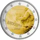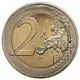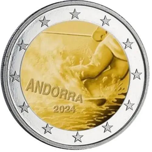 Dynamic scene on the piste featuring a skier making a left turn, skiing toward the right edge of the image, and kicking up snow towards the top left. The skier`s leg with skis and right hand with a ski pole are still visible. Coin`s outer ring depicts the twelve stars of the European flag. |