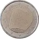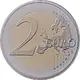 A geographical map of Western Europe spans the outer ring and inner core on the right side of the coin. The inscription 2 EURO is superimposed over the map of Europe, with the numeral “2” located in an open field representing the eastern Atlantic Ocean. 12 stars are located on the right side of the outer ring, with six stars atop the map of Europe and six stars below it; six vertical stripes cut across the inner core of the coin, visually connecting the upper and lower star segments. |