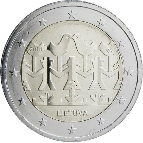 | Obverse description | The national side of the coin features stylised figures of people and birds that are symbolic of the Lithuanian folk dance and song and typical of paper cuttings, a Lithuanian folk art genre. The coin also features the inscription LIETUVA (LITHUANIA), the year of issue (2018) and the mintmark of the Lithuanian Mint. The coin’s outer ring bears the 12 stars of the European Union flag. |