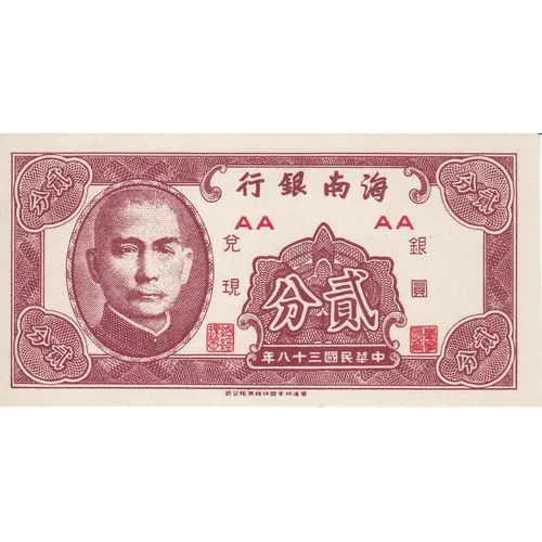 | Obverse lettering | 行銀南海 分貳 年八十三國民華中 (Translation: Hainan Bank Two Cents Year 38 of the Chinese Republic) |