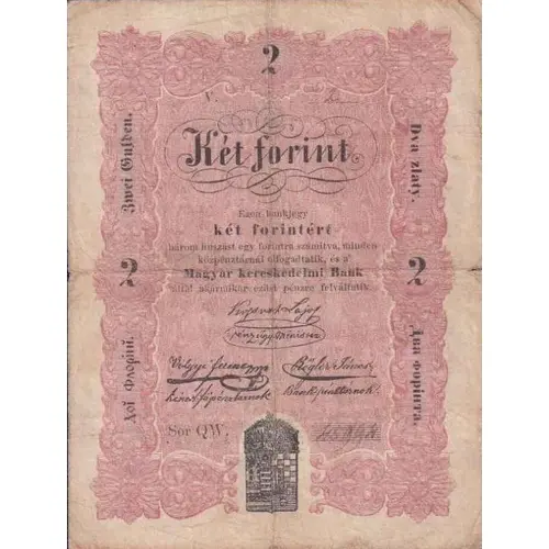 Zwei Gulden. * 2 Dva Zlaty. * KÉT FORINT Ezen bankjegy két forintért, három húszast egy forintra számítva, minden közpénztárnál elfogadtatik, és a Magyar Kereskedelmi Bank által akármikor ezüst pénzre felváltattatik. (Translation: 1 forint This banknote, counting as three twenty coins for a forint, shall be accepted by all public pay desks and shall be exchanged to silver money by the Hungarian Commercial Bank.) |