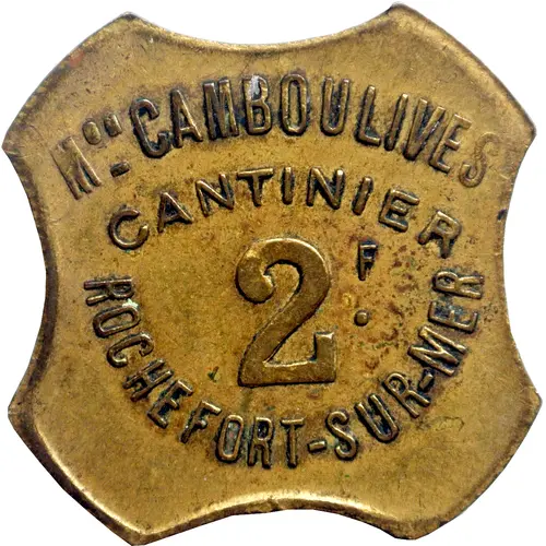 | Obverse lettering | M. Camboulives Cantinier 2F ROCHEFORT-SUR-MER |