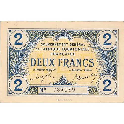 | Obverse lettering | GOUVERNEMENT GÉNÉRAL DE L`AFRIQUE EQUATORIALE FRANÇAISE DEUX FRANCS IMP. CHAIX. PARIS (Translation: General Government of French Equatorial Africa Two Francs) |