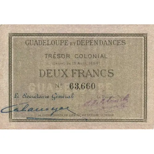 | Obverse lettering | GUADELOUPE ET DÉPENDANCES TRÉSOR COLONIAL (Décret du 18 Août 1884.) DEUX FRANCS. Le contre-valeur en espèces est déposée au Trésor. (Translation: Guadeloupe and Dependencies Colonial Treasure (Decree of August 18, 1884.) Two Francs. The cash equivalent is deposited in the Treasury.) |