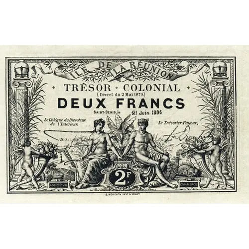 Reverse lettering ÎLE DE LA RÉUNION DEUX FRANCS La contre-valeur en espèces est déposée an Trésor TRÉSOR COLONIAL E. MOUCHON INVT & SCULPT