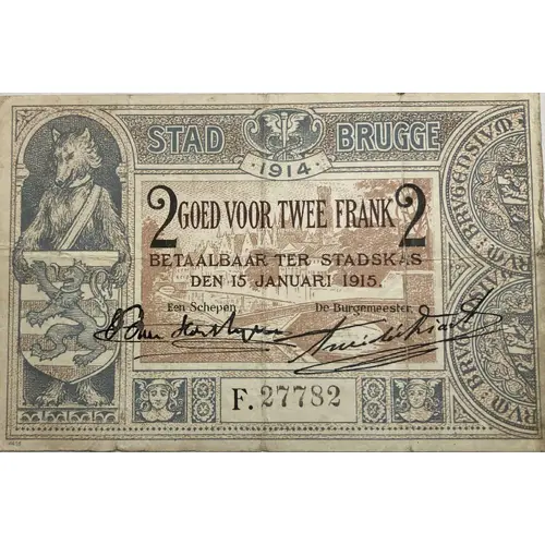 | Obverse lettering | STAD BRUGGE . 1914 . 2 GOED VOOR TWEE FRANK 2 BETAALBAAR TER STADSKAS DEN 15 JANUARI 1915. Een Schepen, De Burgemeester, RVM : BRVGENSIVM + RVM : BRVGENSIVM |