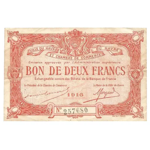 VILLE DU HAVRE ET CHAMBRE DE COMMERCE DU HAVRE émission approuvé par l`administration supérieur BON DE DEUX FRANCS 1916 |