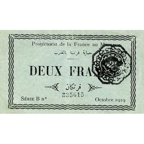 | Obverse lettering | PROTECTORAT DE LA FRANCE AU MAROC DEUX FRANCS |