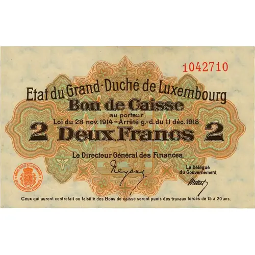 | Obverse lettering | Etat du Grand-Duché de Luxembourg Bon de Caisse au porteur Loi du 28 novembre 1914 - Arrêté g.-d. du 11 décembre 1918 2 Deux Francs 2 Le Directeur général des Finances Le Délégue du Gouvernment Ceux qui auront contrefait ou falsifié des Bons de caisse seront punis des travaux forcés de 15 à 20 ans. (Translation: State of the Grand Duchy of Luxembourg Cash Voucher To bearer Law of November 28, 1914 - General Decree from December 11, 1918 Two Francs The Director-General of Finances / The Government Delegate Those who have counterfeited or falsified Cash Vouchers will be punished with forced labor for 15 to 20 years.) |