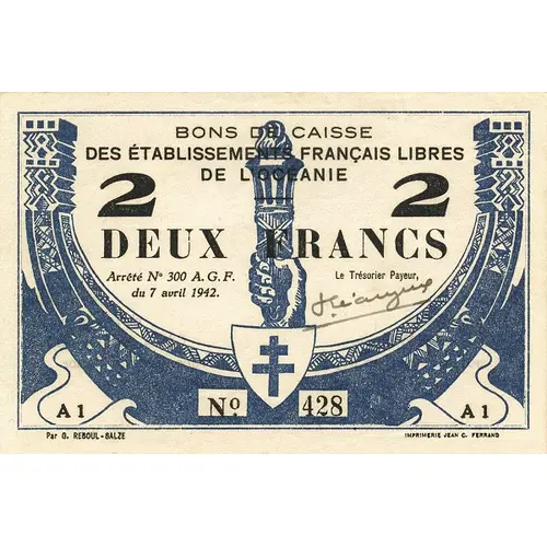 BON DE CAISSE DES ÉTABLISSEMENTS FRANÇAIS LIBRE DE L`OCEANIE DEUX FRANCS Arrêté Nº 300 A.G.F. du 7 avril 1942. PAR G. REBOUL-SALZE IMPRIMERIE JEAN C. FERRAND (Translation: Voucher of the French Free Establishments of Oceania Two Francs Law no. 300 A.G.F. April 7, 1942.) |