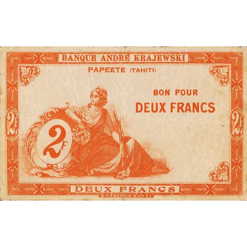 Obverse lettering BANQUE ANDRÉ KRAJEWSKI PAPEETE (TAHITI) BON POUR DEUX FRANCS 2F DEUX FRANCS A. CARLISLE & CO. S.F.