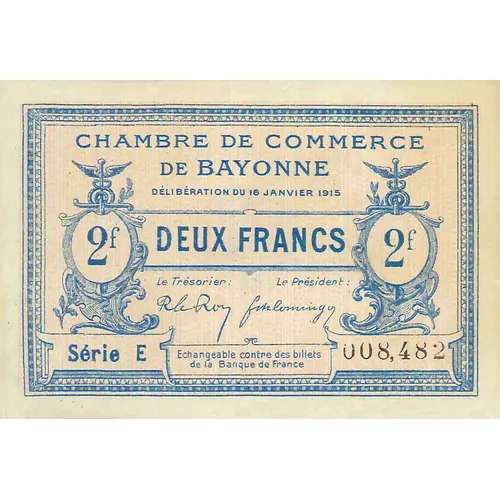 CHAMBRE DE COMMERCE DE BAYONNE DELIBERATION DU 16 JANVIER 1915 2f 2 FRANCS Le Trésorier Le Président SERIE E 008,482 Echangeable contre des billets de la Banque de France |