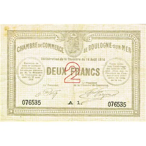 | Obverse lettering | CHAMBRE DE COMMERCE DE BOULOGNE-SUR-MER Délibération de la Chambre du 14 Août 1914 et du 7 Juillet 1916 DEUX FRANCS Le Trésorier Le Président de la Chambre de Commerce 076535 A1 076535 |