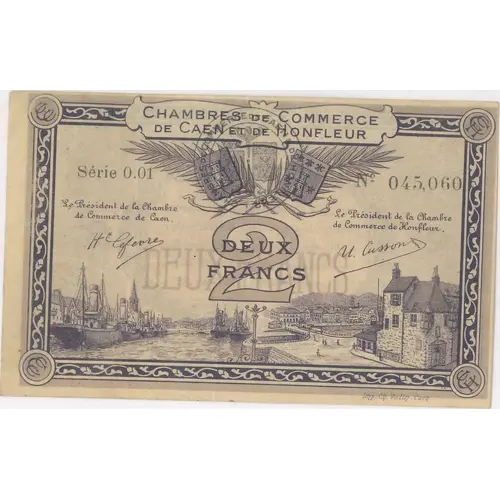 | Obverse lettering | CHAMBRE DE COMMERCE DE CAEN ET DE HONFLEUR 2 DEUX FRANCS Série 0.01 N° 045,060 Le Président de la Chambre de Commerce de Caen Le Président de la Chambre de Commerce de Honfleur Imp. Ch. Valin. Caen |