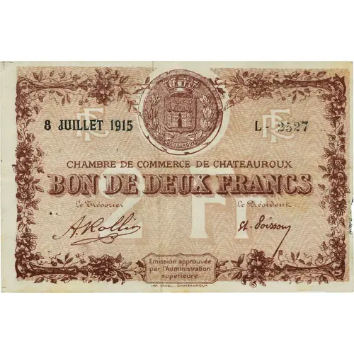 | Obverse lettering | 8 JUILLET 1915 L- 2527 CHAMBRE DE COMMERCE DE CHATEAUROUX BON DE DEUX FRANCS Le Trésorier Le Président Emission approuvée par l`Administration supérieure IMP. BADEL CHATEAUROUX |