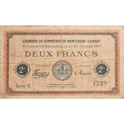 | Obverse lettering | CHAMBRE DE COMMERCE DE MONTLUÇON - GANNAT Autorisation ministérielle du 28 fevrier 1917 DEUX FRANCS Le Trésorier Le Président Série C 7739 Echangeable contre des billets de la Banque de France HERBIN & BOUCHÉ MONTLUÇON |