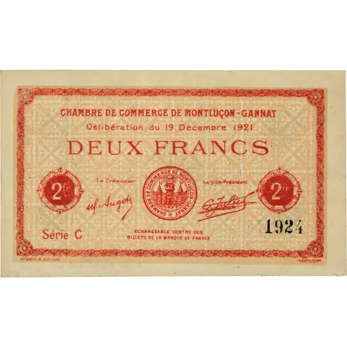 | Obverse lettering | CHAMBRE DE COMMERCE DE MONTLUCON-GANNAT Délibération du 19 décembre 1921 Le trésorier Le Vice-Président Série C 1924 Echangeable contre des billets de la Banque de France HERBIN & BOUCHÉ MONTLUÇON |