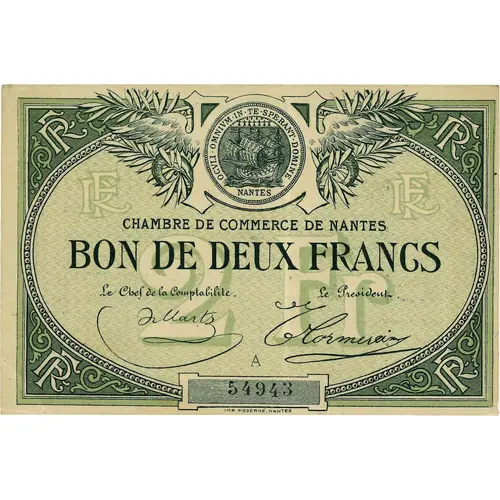 CHAMBRE DE COMMERCE DE NANTES BON DE DEUX FRANCS Le Chef de la Comptabilité Le Trésorier A 54943 IMP. MODERNE NANTES |