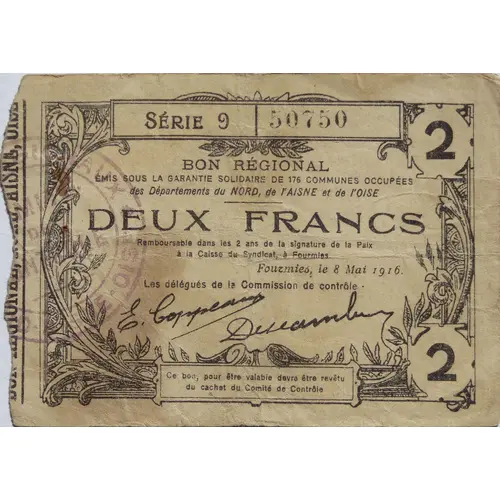 | Obverse lettering | SÉRIE `N° série` BON RÉGIONAL ÉMIS SOUS LA GARANTIE SOLIDAIRE DE 176 COMMUNES OCCUPÉES des Départements de NORD, de l`AISNE et de l`OISE DEUX FRANCS Remboursable dans les 2 ans de la signature de la paix à la caisse du syndicat à Fourmies Fourmies, le `date d`émission` Les délégués de la Commission de contrôle Ce bon, pour être valable devra être revêtu du cachet du comité de contrôle |