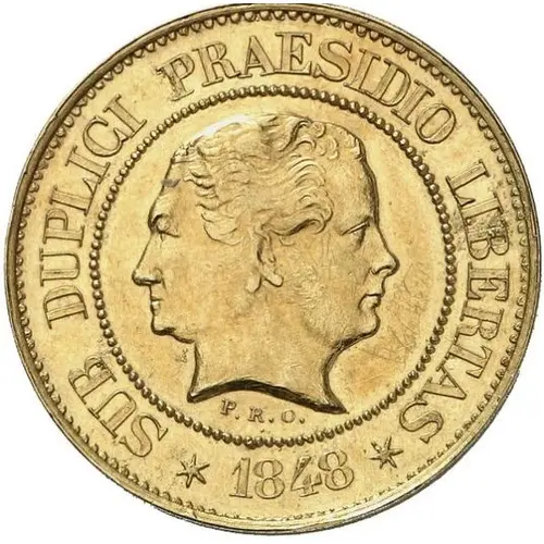 | Obverse lettering | SUB DUPLICI PRAESIDIO LIBERTAS P R O *1848* |