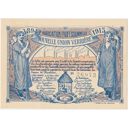 Messieurs les commerçants qui accepteront ce billet prouveront toute leur sympathie pour les ouvriers verriers et plus de patriotisme que M. M. les banquiers et tous les capitalistes qui ont constitué la caisse de prêts. Nous avons été forcés de recourir à ce moyen à cause du refus systématique qu`ils ont opposé à nos demandes d`avances d`argent sur nos titres et sur nos propriétés, refus répété par la Société Générale de Belgique à Bruxelles. Le Secrétaire (signature) Le Président (signature) Le Trésorier (signature) 2 FRANCS (cachet en rouge :) NOUVELLE UNION VERRIERE |
