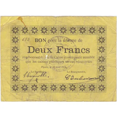 | Légende de l’avers | BON pour la somme de Deux Francs remboursable par la Caisse communale aussitôt que les caisses publiques seront réouvertes Pipaix, le 28 août 1914. Le Secrétaire, Le Bourgmestre, (signature) (signature) |