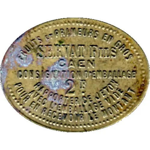 | Obverse lettering | Fruits et Primeurs en gros SERVAT Fils Caen Consignation d`emballage 2 F Rapporter ce jeton avec l`emballage vide pour en recevoir le montant |