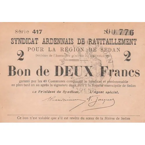 | Obverse lettering | Série 417 N° 00.776 Syndicat Ardennais de ravitaillemenr pour la région de Sedan Décision de l`Assemblée générale du 26 février 1916 2 Bon de DEUX Francs Garanti par les 40 communes composant le syndicat et remboursable au plus tard un an après la signature de la paix à la Recette municipale de Sedan Le Président du Syndicat, L`Agent spécial, Ce bon n`est valable que s`il est revêtu du sceau de la Mairie de Sedan |