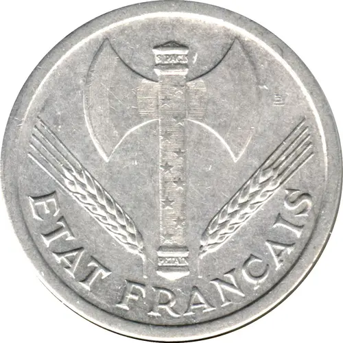 | Reverse lettering | ·TRAVAIL·FAMILLE· ·PATRIE· 2 ·FRANCS· 1943 (Translation: ·WORK·FAMILY· ·MOTHERLAND· 2 ·FRANCS· 1943) |